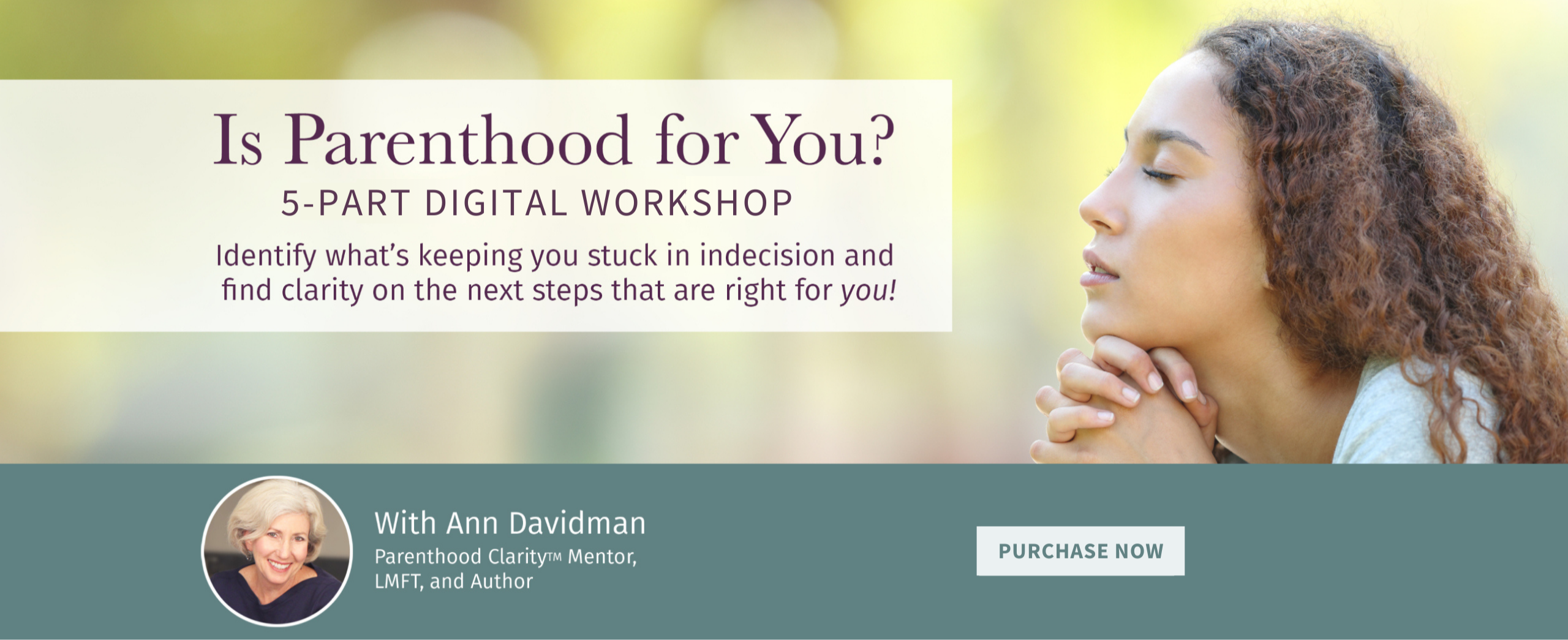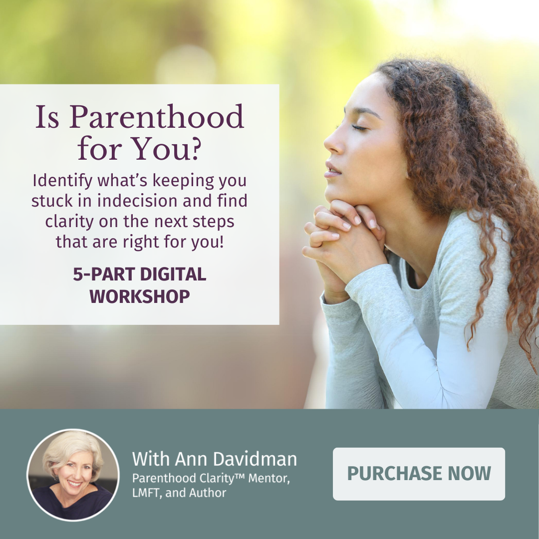 In this 5-part, self-paced online workshop featuring 6.5 hours of content, Ann Davidman, Parenthood Clarity™ Mentor shares her proven method for finding clarity so you can uncover your inner truth and discover what next steps are truly right for you.Â